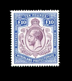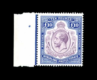 797 nh S.G. #99e imageS.G. #99e, 1919 £10 Purple and royal blue, a pristine left sheet-margin single, wonderfully sharp and detailed impressions of both colors, the blue being wonderfully intense deserving of the moniker "Royal", bright white paper, o.g., never hinged, very fine (Scott #24; for hinged $2,750.00). (Image) for hinged £2,750