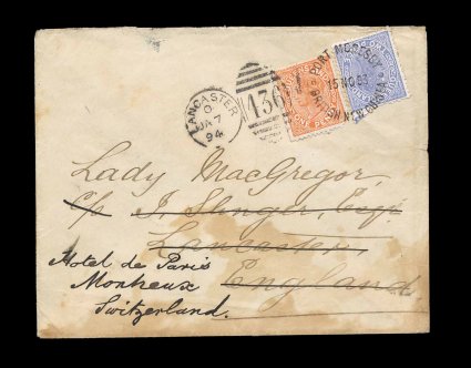 798 c imagePort Moresby/British New Guinea unframed c.d.s., extremely fine and choice strike tying Queensland 1890-92 1p Orange red and 2p Gray blue on 1893 (November 15) cover to England, redirected to Montreux, Switzerland, via Thursday Island, the stamps additionally tied by very fine Lancaster "436" duplex as departure datestamp upon redirection, showing arrival c.d.s. on reverse, the cover is stained at bottom, not affecting stamps which remain very fresh, an unusual usage and a very fine example of the rare application of the c.d.s. to cancel the stamps; a truly outstanding exhibition cover. (Image) Est. 500-750