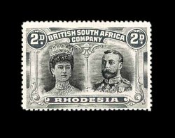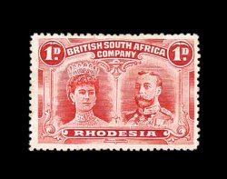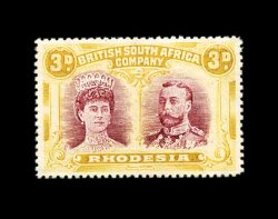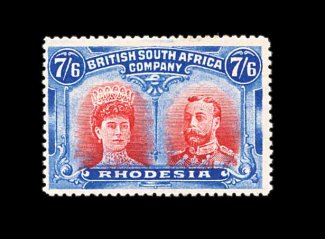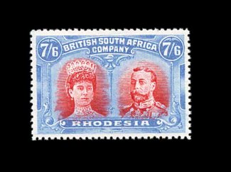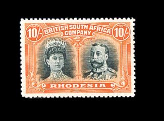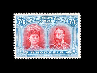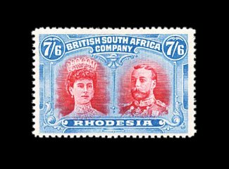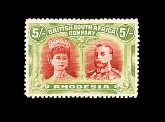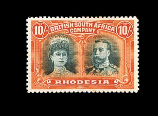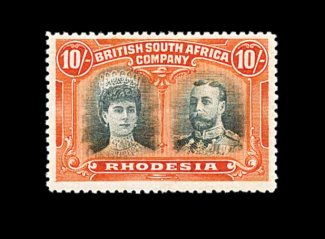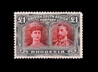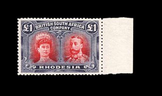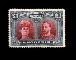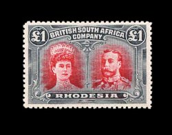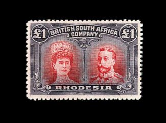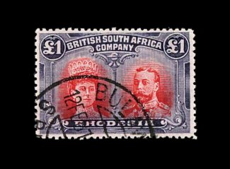 833 O S.G. 166 var. imageS.G. #166 var., 1910 £1 Rose scarlet and bluish black, mid gash in Queen's ear, position 2, strong rich colors, neat Bulawayo c.d.s., tiny internal wrinkle, still very fine; a very scarce variety (Scott #118a var.). (Image) Est. 400-500