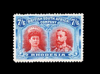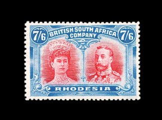 827 og S.G. 162 imageS.G. #162, 1910 7/6 Carmine and bright blue, remarkably deep intense colors and vivid impressions, o.g., lightly hinged, tiny thin spot, otherwise a very fine example of this very scarce stamp (Scott #116 var.). (Image) £1,900