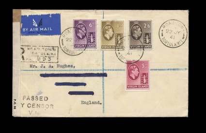 101 c G.G. #116-19 imageS.G. #116-19, 1938 6p-5/- George VI cplt., four high values tied to 1941 linen registered cover to England by Road-Town/Tortola. W.I/22 JY 41" c.d.s., Type 26, matching Road Town registry handstamp and scarce black "Passed/By Censor/V.Is." handstamp at bottom left, St. Thomas and New York transits, opened and resealed by censor on arrival in England, a very fine high value franking sent by transatlantic air mail from New York to England. (Image) Est. 200-300