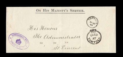 102 O S.G. #CC1 imageS.G. #CC1, Black "Paid at Tortola" double circle Crown handstamp, Type 4, well struck example on cover front of 1903 OHMS cover, with clear "Tortola/SP 18 03" c.d.s. without index letter, Type 10, addressed to St. Vincent and with violet "Commissioner's Office/Virgin Islands" oval official cachet, very fine front; the note in Stanley Gibbons about the official use of the Paid Crown circle applies to #CC1, not #CC2 and is priced at £1,200 used in this way in the 20th century, a scarce marking and usage. (Image) Est. 400-500
