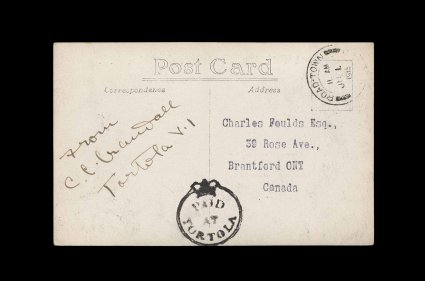 103 c S.G. #CC1 image7 S.G. #CC1, Black "Paid at Tortola" double circle Crown handstamp, Type 4, on address side of 1915 actual photo card of Boat Building at East End, posted to Canada with Leeward Islands 1p Red (S.G. #48) tied to view side by "Road Town/Tortola. V.I/JU 1 1915" c.d.s., Type 17, additional strike on address side, very fine and attractive; Stanley Gibbons lists this Crown Paid marking as existing in red in 1842 but the specialized British Virgin Islands catalog contends it is not known on a 19th century cover, furthermore Stanley Gibbons notes incorrectly that #CC2 was used in the 20th century as an Official Paid handstamp when in fact it was this #CC1 marking, interestingly this is not an official cover indicating official payment but rather a marking to indicate that the postage has been pre-paid since the adhesive paying it is not readily apparent being on the view side. attractive and nice usage of this scarce marking. (Image) Est. 500-750