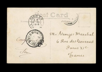 104 c S.G. #CC1 imageS.G. #CC1, Black "Paid at Tortola" double circle Crown handstamp, Type 4, on address side of 1916 actual photo card of "Paraquita Estate" on Tortola, this paid marking overstrikes a very rare "Official Paid/Road Town, Tortola. V.I." double circle handstamp, Type 20, the paid marking was intentionally placed over the official marking as the official marking was put on in error, a pair of Leeward Islands 1/2p Green (S.G. #47) tied to the view side of the card by "Road Town/Tortola. V.I./FE 7 1916" c.d.s., Type 17, actually pays the the postage to France, backstamped Paris, very fine; the intention was to mark the address side "Paid" as the stamps were not readily apparent, not to mark it official, less than ten examples are known of this official marking and this is the only one that has been found where it was applied in error. (Image) Est. 1,500-2,000