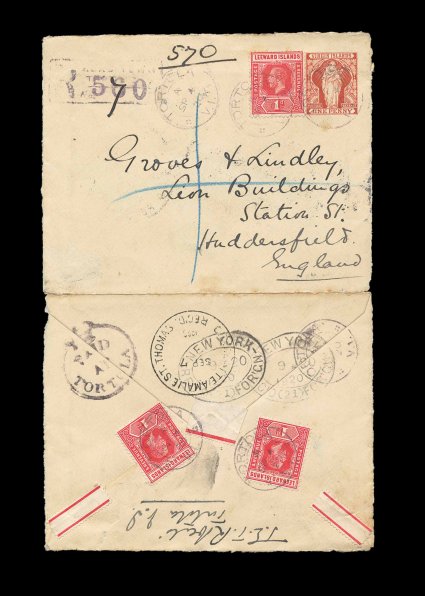 105 c S.G. #CC1 imageS.G. #CC1, Black "Paid at Tortola" double circle Crown handstamp, Type 4, on the reverse of 1901 1p Brown red postal entire (BVI #PS6, 120x94mm), registered to England with three Leeward Islands 1p Bright scarlet (S.G. #48a; two on the reverse) by "Tortola/V.I./SP 4 20" double circle c.d.s., Type 21, St. Thomas and New York transits, entire has been opened out for display and minor facial scuff affecting no stamps or markings, otherwise very fine commercial usage; this is a late usage of this Crown Paid marking and unusual as it was usually applied to the address side of an item when stamps were on the reverse to inform various post offices in its travel that it was fully paid. (Image) Est. 750-1,000