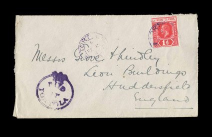 106 c S.G. #CC1 imageS.G. #CC1, Violet "Paid at Tortola" double circle Crown handstamp, on the front of commercial cover to England, with two 1p Scarlet (S.G. #70b), one on reverse, each tied by violet "Tortola/V.I./FE 15 21" double circle c.d.s., Type 21, cover opened out for display, otherwise very fine; this Crown Paid marking was undoubtedly applied because a stamp was on the reverse to indicate it was fully paid, not only is this the latest documented use of this Crown Paid handstamp, but it is also the only one we have seen in violet, all others being black, the cancels are also in violet which is neither usual or listed as such in the specialized catalog. (Image) Est. 1,500-2,000