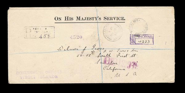107 c image1907-19 "Official Paid/Road Town. Tortola, V.I" double circle handstamp, Type 20, on registered 1916 OHMS cover to San Jose, California, "Road Town/Tortola. V.I/MY 10 16" double circle c.d.s., Type 17, plus an unusual violet "Government Offices/Virgin Islands" two line official cachet, registry handstamps of Road Town and St. Thomas plus various transits on the reverse, backstamped, very fine; a lovely international official cover recognizing the official payment of both postage and registry fee, less than ten examples of this official marking are known. (Image) Est. 500-750