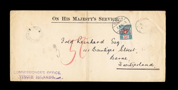 108 c image1907-19 "Official Paid/Road Town, Tortola. V.I." double circle handstamp, Type 20, this very scarce marking is applied to an OHMS cover to Bern, Switzerland and accompanied by "Tortola/V.I./MR ? 18" double circle c.d.s., Type 21, plus "Commissioner's Office/Virgin Islands." violet two-line official cachet, this official usage was not recognized by Switzerland and a 50c Green and red postage due is tied by "Bern/Brief Trager/2. V. 16." c.d.s., vertical fold to cover and some light toning, a fine and very rare usage; less than ten examples of this very scarce official marking are known, then in combination to this less than usual destination and postage due besides makes for a very rare cover indeed. (Image) Est. 750-1,000