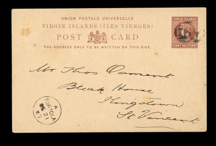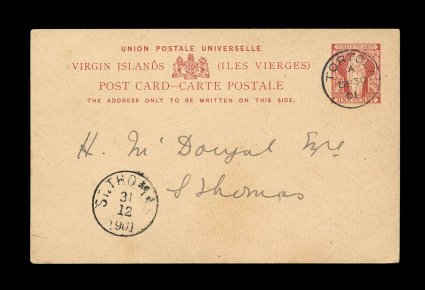 111 c BVI #PS5 imageBVI #PS5, 1901 1p Brown red on buff postal card, fresh example posted to St. Thomas, imprint cancelled with clear "Tortola/DE 30 01" c.d.s. with index letter "A", Type 10, St. Thomas receiving c.d.s. on front, very fine; index letters indicate differing cancelling devices of the same type, this cancel is almost invariably found with index letter "C" in its early use and without index letter in its later period, the device with index letter "A" is very scarce, of the numerous items with this cancel in the McCann collection this is the only item with a Type 10 cancel index letter "A". (Image) Est. 200-300