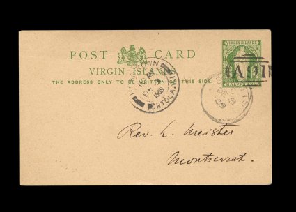 110 c BVI #PS4 imageBVI #PS4, 1901 1/2p Green on buff postal card, a marvelous usage to Montserrat, a lovely clear "A91" oval bar cancel, Type 8, this being the latest known usage of this marking, used in combination with "Road-Town/Tortola. V.I/DE 3 1909" c.d.s., Type 17, which is very unusual as this is the only example where their periods of use overlap, St, Kitts transit on front and St. Thomas transit on the reverse, backstamped, extremely fine; all that one could ask for in this rare usage. (Image) Est. 300-400