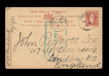 112 c BVI #PS5 imageBVI #PS5, 1901 1p Brown red on buff postal card, nice commercial usage to England requesting a catalog, from the "Sub-Postmaster" John James Haddock at Virgin Gorda, "Virgin-Gorda/V.I./JY 26 13" c.d.s., Type 12, cancelling imprint with "Road-Town/Tortola. V.I/JY 28 13" transit at left, slight postal wear causing a faint corner crease, otherwise very fine; a nice and scarce usage. (Image) Est. 200-300