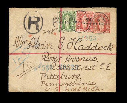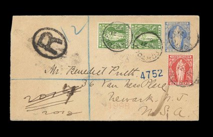118 c BVI #PS9 imageBVI #PS9, 1901 2 1/2p Light ultramarine on cream laid paper, postal entire, 140x78mm, registered to the United States with 1/2p Yellow green vertical pair and 1p Rose carmine (S.G. #86-87), tied by "Tortola/MR 21 04" c.d.s. without index letter, Type 10, St. Kitts and New York transits, backstamped, very fine (Scott #21-22). (Image) Est. 200-300