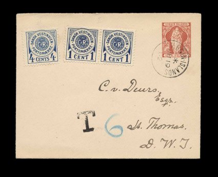 114 c BVI #PS6 imageBVI #PS6, 1901 1p Brown red on buff laid paper, exceptionally clean and attractive postal entire, 120x94mm, posted to St. Thomas with scarcer "Virgin Islands/JU 19 02" c.d.s., Type 11, backstamped, despite the close proximity, St. Thomas is a foreign country to this British Colony and required 2 1/2p postage, marked "T6" and exceptional quality 1c Blue horizontal pair and 4c Blue postage dues have been applied (Scott #J1-2), certainly proper to this cover but not cancelled as was the normal practice in the Danish West Indies, extremely fine and very rare usage. (Image) Est. 500-750