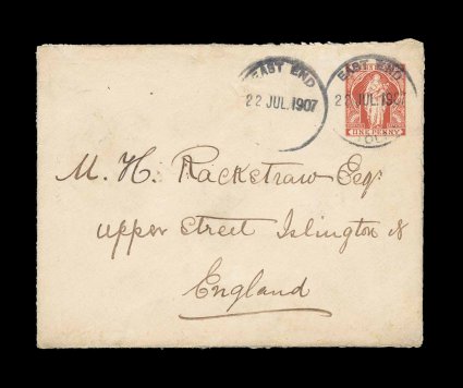 115 c BVI #PS6 imageBVI #PS6, 1901 1p Brown red on buff laid paper, postal entire, 120x94mm, to England, an immensely rare usage with two strikes of "East End/Tortola. V.I./22 jul 1907" temporary rubber c.d.s., Type 14-I, this is the earlier variety with san-serif letters in "Tortola", on the reverse is the even rarer "Road Town/Tortola, V.I./23 Jul 07" temporary rubber c.d.s. in blue, Type 16, additional St. Thomas transit and backstamped London, choice very fine; East End covers are of the greatest rarity, the two types of provisional cancels are the only cancels that were used at the East End post office (Type 14-II is not known on cover) and postings from there are the scarcest of all covers that exist (the Anegada temporary rubber c.d.s. is also not known on cover, but later cancels are found from that post office), only six covers are known from East End, additionally the Road Town temporary rubber c.d.s. is only known as a transit marking on East End covers and only two examples are known, this being a particularly choice example. (Image) Est. 3,000-4,000