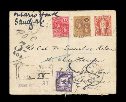 116 c BVI #PS6 imageBVI #PS6, 1901 1p Brown red on buff laid paper, postal entire, 120x94mm, registered to London with 3p Purple on pale yellow and 1p rose carmine (S.G. #82, 87) tied by "Tortola/V.I./JA 16 23" double circle c.d.s., Type 21, Road Town registry handstamp and Post Office handstamp at bottom left, forwarded on reaching Folkstone, England, but also evidently overweight as charged 3p due, double the 1 1/2p rate per additional ounce, Great Britain first issue 3p Violet postage due (S.G. #D5) tied at ultimate destination, numerous transits and backstamps on the reverse including St. Thomas and New York, couple small edge tears to cover, not affecting stamps or markings, otherwise a very fine usage (Scott #49, 54, J5). (Image) Est. 300-400