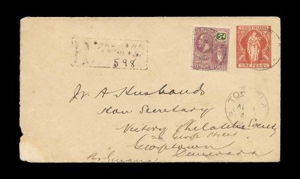 117 c BVI #PS7 imageBVI #PS7, 1901 1p Brown red on buff laid paper, postal entire, 140x78mm being a much scarcer size for this denomination envelope, registered to Georgetown, British Guiana with scarce 1922 5p Dull purple and olive (S.G. #97) tied by "Tortola/V.I./AU 8 25" double circle c.d.s., Type 21, Road Town registry handstamp, St. Thomas transit, backstamped, small edge tear at top, nearly very fine; rated per the UPU rate of 3p postage plus 3p registration for 6p, but could have gone by British Empire 2p postage rate for a total of 5p; scarce and interesting usage (Scott #62). (Image) Est. 200-300