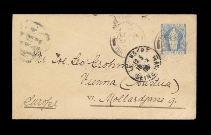 119 c BVI #PS9 imageBVI #PS9, 1901 2 1/2p Light ultramarine on cream laid paper, postal entire, 140x78mm, posted to Austria with "Road-Town/Tortola. V.I/JA 27 1908" double circle c.d.s., Type 17, St. Thomas transit and routed through France with Havre transit on the front, backstamped Vienna, slight overall aging to reverse, otherwise very fine and an uncommon posting. (Image) Est. 200-300