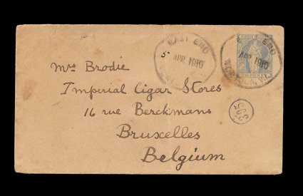 120 c BVI #PS9 imageBVI #PS9, 1901 2 1/2p Light ultramarine on cream laid paper, postal entire, 140x78mm, posted to Brussels, Belgium with two strikes of very rare "East End/Tortola, V.I./5 Apr 1910" temporary rubber c.d.s., Type 14-I with san-serif letters in "Tortola", the numeral "5" is inserted by hand and the distorted state of these late strikes (probably the latest known example) illustrates why these are called "temporary" cancels, Road Town and St. Thomas transits on the reverse, envelope a bit aged and has a vertical fold, the sender also covered the reverse of the cover with detailed written instructions for the recipient to subscribe to the overseas edition of the Daily Mail for him, a fine and extremely rare cover from a post office of which there are only six covers known. (Image) Est. 2,000-3,000