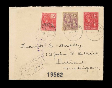 121 c BVI #PS10 imageBVI #PS10, 1926 1p Red on white laid paper, postal entire, registered to the United States with 1 1/2p Carmine red and 3p Purple on pale yellow additional adhesives (S.G. #90, 97), tied by "Tortola/V.I./MY 21 28" c.d.s., Type 21, Road Town registry handstamp, St. Thomas transits and backstamped Detroit, fresh and attractive cover, extremely fine; by far the scarcest item of postal stationery of the Virgin Islands with very few examples known used (Scott #56, 61), (Image) Est. 500-750