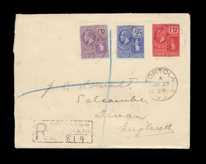 122 c BVI #PS10 imageBVI #PS10, 1926 1p Red on white laid paper, postal entire, registered to England with 1927 1p Bright violet and 2 1/2 Bright blue additional adhesives (S.G. #88, 95), each tied by light "Tortola/V.I./JY 27 28" c.d.s., Type 21, with additional clear strike below, Road Town registry handstamp, St. Thomas and New York transits plus several English transits and backstamped Salcombe in Devon, very fine; exceptionally scarce postal entire in used condition (Scott #55, 59). (Image) Est. 500-750