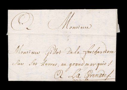 123 c image1751 Inbound folded letter to Grenada, very clean and attractive letter datelined "St. Pierre, Martinique Le 12 Mars 1751", in this period privately carried by ship without postal marking, extremely fine; the French settled Grenada in 1654 and ruled the Island until 1762, this is the earliest recorded cover to Grenada in private hands. (Image) Est. 300-400