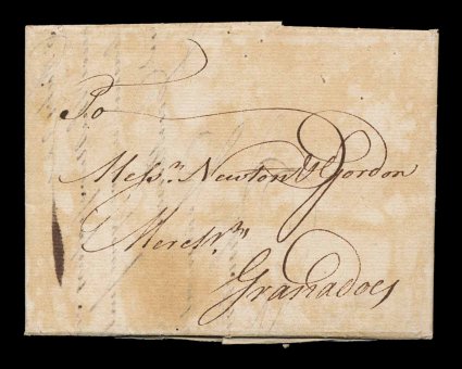 124 c image1763 Inbound folded letter to Grenada, from Johnston & Jolly of London on September 19, 1763, to Newton & Gordon arriving in Grenada on October 7, 1763, carried by ship without postal marking as normal in this time period, slight aging to paper but still fresh and very fine; Britain captured Grenada from the French on March 3, 1762 during the Seven Years War and the island was ceded to Great Britain on February 10, 1863, this is the earliest recorded British cover to Grenada. (Image) Est. 200-300