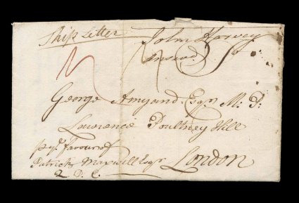 125 c image1764 Folded letter to London, datelined "Grenada April 26th 1764", carried by private ship "pr. favour of/Patrick Maxwell Esqr./Q.D.C." (Whom God Preserve), manuscript "Ship Letter" without port designation as this is a very early example of this type of service, appears to be rated 4p which equals 1p gratuity to the ship's captain and 3p internal postage, this puts the port within 80 miles of London, small Bishop's mark receiving handstamp on the reverse, very fine for this eighteenth century letter; this is the earliest recorded letter from Grenada. (Image) Est. 200-300