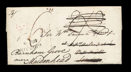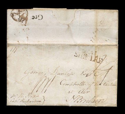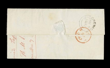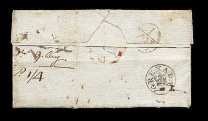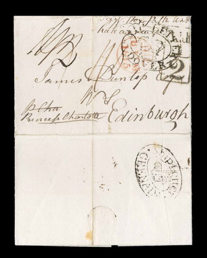 132 c image1815 "Ship Letter/Grenada" double oval with Crown handstamp, on the reverse of folded letter to Edinburgh, Scotland, on front is a somewhat similar "Ship Letter/Dover" double oval and Crown handstamp where it made port in Britain, plus other transit markings including a boxed rate marking for the Scottish 1/2p toll tax charge, backstamped, very fine, an extremely rare and desirable ship cover; this Grenada ship marking is very scarce as this was applied to an outbound cover that had been given to the post office, ship letters were usually given directly to the ship captain rather than the post office, and the ship letter markings were normally applied to inbound covers carried by private ship to indicate the appropriate service and rate to be charged, this is one of only six recorded examples with this marking; ex-Hackmey. (Image) Est. 2,000-3,000