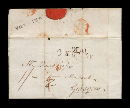 127 c image1785 "GRENADA" straight line handstamp, the rare second handstamp in all capital letters, a clear strike on the reverse of attractive folded letter to Glasgow, datelined "Grenada 19th March 1785", carried as a ship letter with "Deal/Ship Lre" handstamp on the front, both black and red Bishop receiving marks, very fine letter; the letter itself is a normal business letter with bill of lading for sugar included, but letter makes reference to Negroes (slaves) being inoculated and recovered from the smallpox; this straight line marking is of the greatest rarity and was used for only a few months, it is the only know example making this a highly desirable and key letter for the collector of this country; ex-Towers. (Image) Est. 2,000-3,000