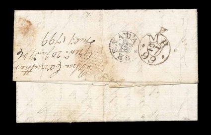 130 c image"Grenada/Mar 23 99" straight line dated handstamp, light but full strike of this new marking on reverse of folded packet letter to Glasgow via Falmouth, rated "4/10" in manuscript and late double circle Bishop receiving mark on reverse, minor deterioration along file fold, otherwise fine; this marking with date was instituted to establish independently when the letter was sent to prevent senders from making a request for insurance after they knew that a ship was lost by predating their letter; despite this being a light strike, this cover is important in that it is the earliest recorded example of this marking, being within less than two months of the latest recorded circular Crown handstamp offered above. (Image) Est. 200-300