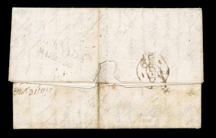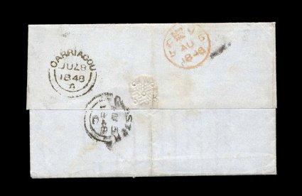 138 c image"Carriacou/JU 78 (inverted) 1848/A" double-arc c.d.s. strong clear strike of this rare marking on the reverse of folded letter to Chester, England, date in postmark is in error with wrong month and inverted "78" which looks something like "28", should be "JL 8" as the letter is datelined "Carriacou 8th July 1848" with a copy of a letter of June 22nd, London transit and backstamped, very fine and choice; this cover has caused confusion as to the number of known examples of this rare marking from this small island of the Grenadines, it has been counted twice as a June 28th and July 8th cover, correcting this there are only three known letters, this being the latest full letter, plus there is a fourth example which is on a small fragment of a cover dated December 8, 1848, the letter offered here is the most interesting and attractive of this tiny census; ex-Russell Jones. (Image) Est. 3,000-4,000