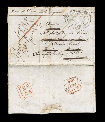 133 c image1840 Soldier's concession rate folded letter of a sergeant in the 10th regiment on Grenada, light small Grenada double-arc c.d.s. with serifed letters on the reverse overstruck by British backstamp, rated 1p which was the favorable rate given to military personnel anywhere in the world back to England, forwarded from Windsor to Heightsbridge being charged another 1p, then missent to Hounslow before reaching its final destination, countersigned by the commanding officer as required, a lengthy letter to family, normal postal wear, otherwise very fine; a scarce and desirable usage. (Image) Est. 300-400