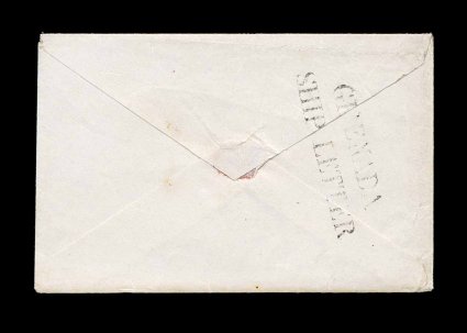 134 c imageTwo line "Grenada/Ship Letter" handstamp, nice strike neatly applied to the reverse of a tiny cover to the Colonial Bank in Grenada in approximately 1842, on the front rated "4p" in manuscript, mended tear on the front from opening not affecting markings or detracting to any significant degree from the attractive appearance of this lovely usage, otherwise very fine; this marking is used the way it was intended by being applied to inbound ship letters, the London proof book shows that this marking, as well as the "Carriacou/Ship Letter" handstamp, were sent to Grenada on August 27, 1841, this is the unique example of the "Grenada/Ship Letter" marking, and no example of the Carriacou marking is known except with the "Ship Letter" removed; ex-Messenger and Hackmey. (Image) Est. 5,000-7,500