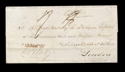 135 c image1845 "Carriacou" brown straight line handstamp, with manuscript "23/8/45" date below, this rare marking is applied to the bottom left of a folded cover to The Secretary of the Wesleyan Missions in London, "1/-" crossed out and re-rated "2/-", backstamped, horizontal file fold between the handstamp and the date, very fine; Carriacou is the major island of the Grenadines that stretch between Grenada and St. Vincent belonging to Grenada, all mail from there is quite scarce, but this interesting marking was the first marking sent to that post office, it is found in the London proof book as "Carriacou/Ship Letter" and was sent to Grenada in August of 1841, evidently it was more useful as a normal town name marking as no example with the "Ship Letter" portion is known, though one of three examples dated 1842 shows a trace of it establishing that it indeed was removed, this 1845 cover is the only other cover with this rare straight line marking of a total of four examples. (Image) Est. 5,000-7,500