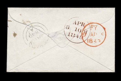 136 c image"Grenada/AU 9 1847" sans serif double-arc c.d.s., well struck example of this surprisingly rare postmark, on reverse of folded cover to the Wesleyan Mission House in London, backstamped, very fine; this later style double-arc marking is normally quite common in most of the British Colonies, however in Grenada the similar marking with serifed letters was used much more extensively than this postmark; this is one of only three recorded examples, with only one used earlier in June of 1847. (Image) Est. 400-500