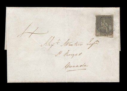 139 c image1853 Inbound interisland cover from Trinidad, attractive folded cover with (1p) Brownish grey Britannia (S.G. #6), an imperforate issue that shows evidence of having been unofficially rouletted on three sides, tied to folded cover to St.George's by boxed numeral "1" cancel, portion of small Trinidad double-arc c.d.s. on the reverse along with well struck large "Grenada/AP 10 1853" double-arc receiving c.d.s. across the letterjoin with inverted index letter "B", manuscript "4" rate that was to be collected from the recipient, the stamp paid internal Trinidad postage postage only, very fine and attractive; this cover makes a nice addition to a Grenada collection being very analogous to the 1p frankings from Grenada to Trinidad in the early 1860's. (Image) Est. 400-500