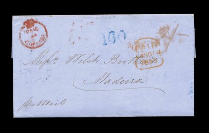140 c S.G. #CC2 imageS.G. #CC2, "Paid at Grenada" red Crowned circle handstamp, a wonderfully strong and clearly struck example of this scarce postmark, on neat folded letter to Madeira, well struck large "Grenada/23 OC 1855" double-arc c.d.s. on the reverse, red manuscript "2/-" rate marking, plus Madeira handstamp "100" rate marking, red Plymouth and London transits, a choice and extremely fine cover; this business letter (about Madeira wine of course, which wasn't selling well in Grenada) is one of the finest available Paid Crowned circle usages to a foreign country available. (Image) Est. 3,000-4,000