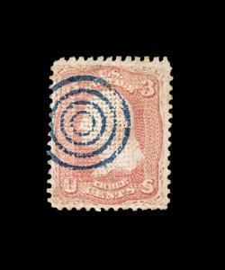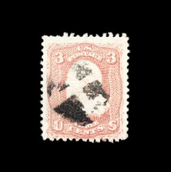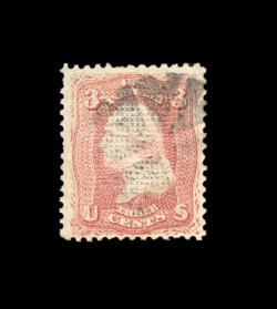 1086 O 85 image#85, 3c Rose, "D" grill, used, well centered within uncharacteristically large margins, rich color, neat blue fancy cork postmark, very fine and quite choice; 1989 PF certificate. (Image) 1,020.00