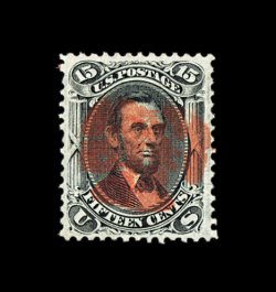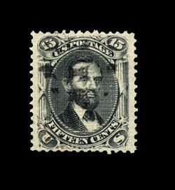 1099 O 98 image#98, 15c Black, "F" grill, a lovely used example, being in a quality not often encountered, marvelously well centered within unusually large margins, strong rich color and impression wonderfully contrasted by a beautiful strike of a red cork cancel, extremely fine; a stamp with great eye appeal; 2003 PF certificate. (Image) 330.00
