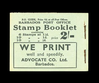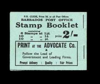 2001 BK S.G. #SB6 imageS.G. #SB6, 1933 2/- Badge of the Colony complete booklet, black on pale green with Advocate Co. Ltd. advertising on the front cover, containing panes of ten of the 1/2p Green and 1p Scarlet, and a pane of six of the 1 1/2p Orange, all perf. 14 of the second printing (S.G. #230, 231, 231b), stapled at right, made from sheet stamps just clipping a few perfs. at top as usual, o.g., n.h., very slight rust stains from staples on the covers, otherwise a fresh and crisp booklet, very fine; listed but unpriced in Stanley Gibbons, this booklet not even listed in Rogers (Scott #166b, 167b, 168a: unpriced). (Image) Est. 750-1,000