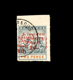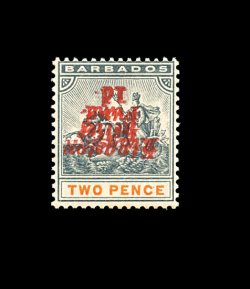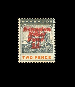 2005 O B1d image#B1d, 1907 "Kingston Relief Fund/1d" surcharge on 2p Slate and orange, double surcharge, widely spaced form of this variety with one in the normal position and the other split, being lower and shifted strongly to the left, tied to small piece by Barbados c.d.s., very fine; 1955 RPS certificate (S.G. #153b; £750). (Image) 650.00
