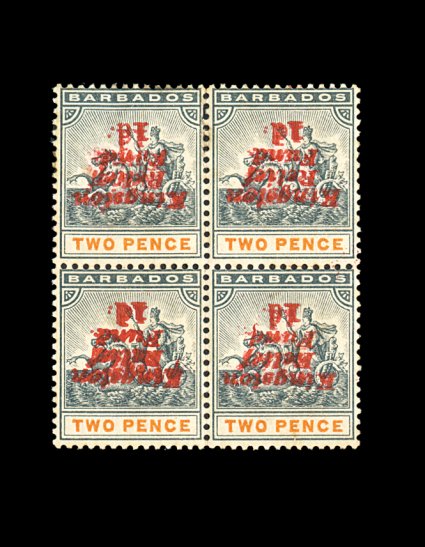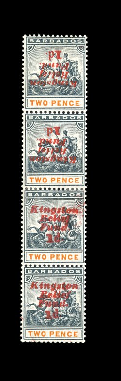 2007 ogbl B1e #B1e, 1907 "Kingston Relief Fund/1d" surcharge on 2p Slate and orange, double surcharge, both inverted, mint block of four (some separated perfs. between top pair causing short perfs on left stamp), two distinct surcharges of nearly equal strength, one being displaced slightly lower, centering and spacing indicates this comes from the same sheet as the single above, o.g. slight gum toning, otherwise very fine except as note above; 1975 BPA certificate stating at that time "made from genuine type but of uncertain status" (S.G. #153c; £2,800). (Image) 2,400.00