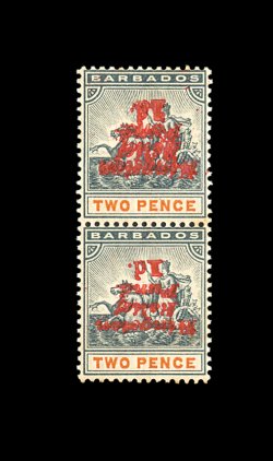 2009 og S.G. #153f imageS.G. #153f, 1907 "Kingston Relief Fund/1d" surcharge on 2p Slate and orange, inverted surcharge in vertical pair, one normal, one double, the top stamp being distinctly double surcharged, each being a strong equal impression, displaced by a little over 1/2mm, o.g., double surcharged stamp n.h., very fine; like the tete-beche strip above this variety is caused by the fact that surcharging the full sheet required more than one pass in the press, in this case one pass was shifted one stamp lower causing a row to be printed twice; Stanley Gibbons does not make clear whether their listing is for inverted or upright overprints, but it can exist either way for the same reasons, only priced used and this pair is purported to be the only known mint example (Scott #B1, B1e; se-tenant variety not listed). (Image) Est. 750-1,000