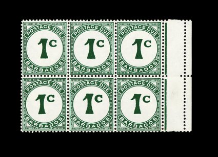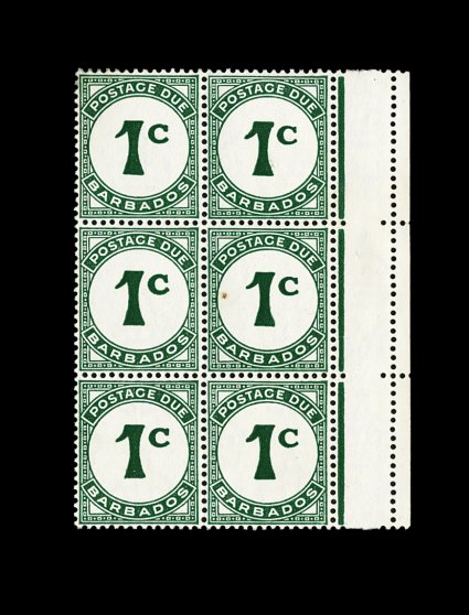 2010 nhbl S.G. #D4ab imageS.G. #D4ab, 1950 1c Green, crown missing in watermark, right sheet-margin block of six (3x2), the error appearing in the bottom row between the right pair, o.g., n.h., very fine; this error is actually quite rare on the 1c value as the missing crown was soon replaced, but with the wrong type crown producing another variety (Scott #J4 var.). (Image) S.G. £350+