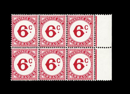 2019 ogObl Barbados mint and used stock and accumulation, includes twelve three-ring stock binders stuffed with individual sales sheets by Stanley Gibbons number, the first four books, which contain the 19th century and first half of the 20th century are quite sparse and are of little significance, starting with the King George VI issues there is a very comprehensive stock up to the mid-1990's, these are often found in several mint singles and blocks of four as well as desirable used including some blocks of four, many better sets are found in quanities of around ten complete mint sets, in addition to the large stock of mint and used issues the significant value in these books is found in the varieties, usually these are inverted watermark varieties, but including some missing colors such as a mint gutter pair of S.G. #524a and a mint single of S.G. #631a, there is also a stack of pages, stock pages and sheets, we note two 6c Carmine postage due errors (#J6a), one in a full sheet, and we also note a full sheet of 100 of Ultramarine and yellow ochre definitive with inverted watermark (S.G. #351aw; £7.50 per stamp), condition is mostly fresh and quite clean particularly in the modern, which is nearly all o.g., n.h. fine-very fine. Est. 750-1,000