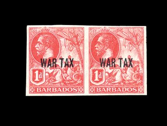 2013 og MR1a image#MR1a, 1917 "War Tax" overprint on 1p Carmine, imperforate horizontal pair, a very scarce unissued variety, clear to large margins all around, o.g., right stamp with light creases, otherwise very fine; 1965 RPS certificate (S.G. #197 var.). (Image) 4,000.00