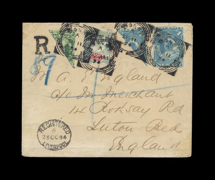 2186 c 38a, 39a image#38a, 39a, 1p Light blue and 2p Green, diagonal halves used as 1/2p and 1p respectively, tied to the same registered cover along with 2p Green and carmine from the first overprinted issue (#3), and 1p Light blue (#38), all tied by "Bonny/SP 11 94" squared circles, registered to Luton in England, London transit, backstamped, couple light horizontal creases to cover and small edge tears, not affecting the stamps, fine and scarce; the bisects were used out of Bonny River in August and September of 1894, covers out of the Niger Coast Protectorate are scarce in any condition and particularly nice with both bisects on the same cover (S.G. #46a, 47b). (Image) Est. 300-400
