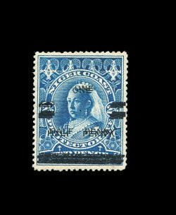 2181 og 23 image#23, 1893 "Half Penny" Blue black surcharge on 2 1/2p, nicely centered and fresh, o.g., h.r., very fine; an attractive example of this rare stamp, of which only 23 examples are believed to exist; 1933 RPS certificate (as old S.G. #15) (S.G. #16; £3,250). (Image) 3,000.00