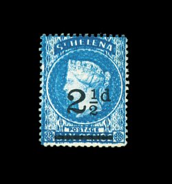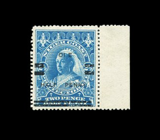 2187 og 54a image#54a, 1894 1/2p on 2 1/2p Blue, double surcharge, exceptionally well centered, strong rich color, o.g., small bend at top left, still a very fine example of this rare error; it is believed that only three rows from one sheet (24 stamps) were printed with the double surcharge; clear 1964 BPA certificate (S.G. #65a; £2,750). (Image) 1,750.00