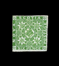 2189 ng 4 image#4, 6p Yellow green, a sound unused single with three large to extra-large margins, just clear to barely touching on the fourth, brilliant green color and a sharp detailed impression on fresh nicely blued paper, nearly very fine for this scarce unused value; 1938 BPA certificate (S.G. #5; £4,000). (Image) 3,250.00